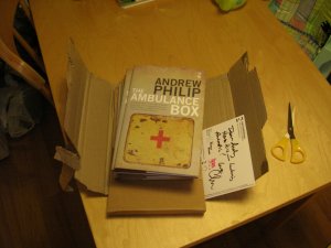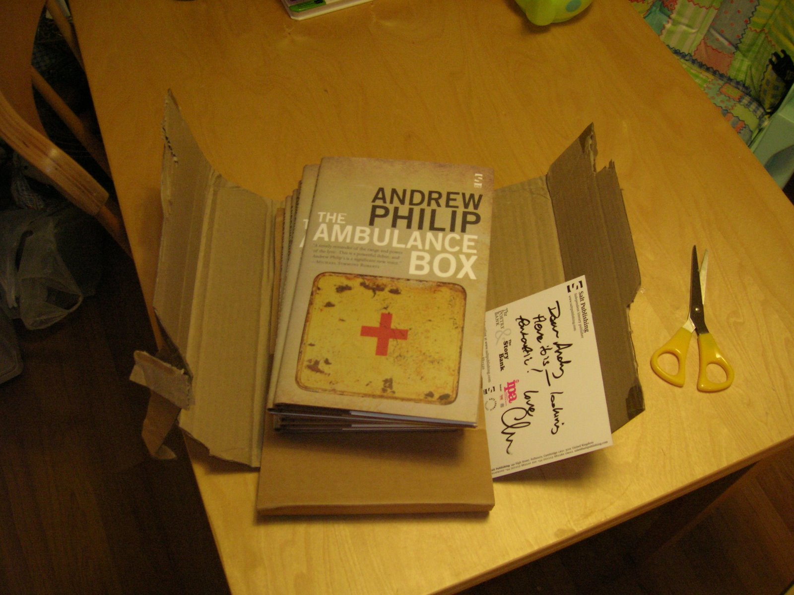 I was jealous that Rob Mackenzie had got his books yesterday, so I just had to get up early this morning and zip down to the postal depot to pick up my author copies of The Ambulance Box, which the postman had failed to leave in our designated “safe place” yesterday. I wasn’t quite banging on the door begging to be let in, but I was there only a few minutes after they turned the key. Don’t know whether the postal worker who handed the package over to me had any inkling of what it was, but she can’t have failed to see my grin as broad as the Firth of Forth as I skipped out the building.