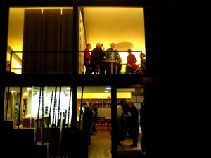 Anyway, the launch was scheduled to begin at 7 pm. From about 6.55, I was stuck at the punters’ side of the librarians’ desk signing books for about half an hour. I had to make an effort to break off and slip into the lift (there was little hope of getting easily up the stairs) and up to the mezzanine, where Rob and I read.